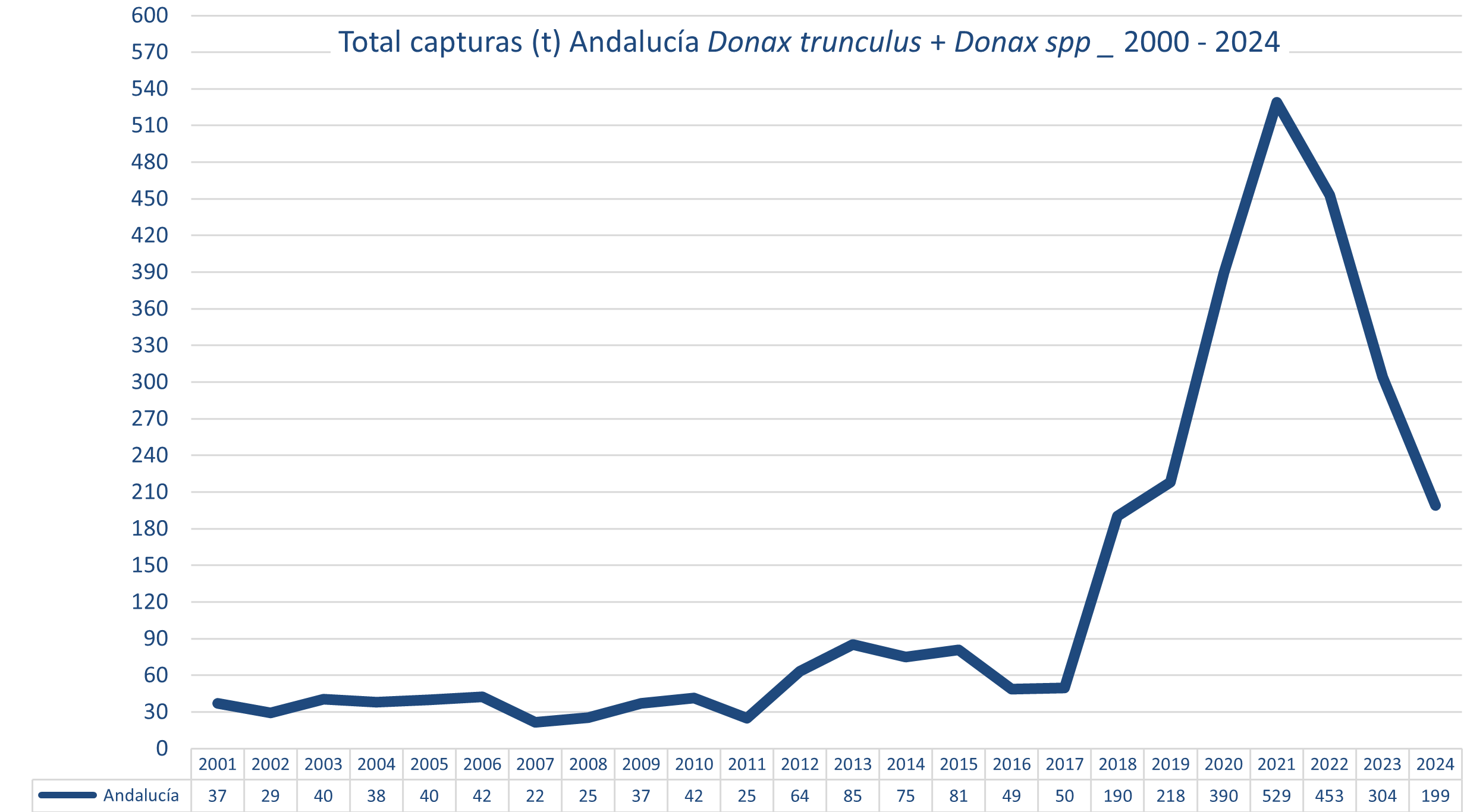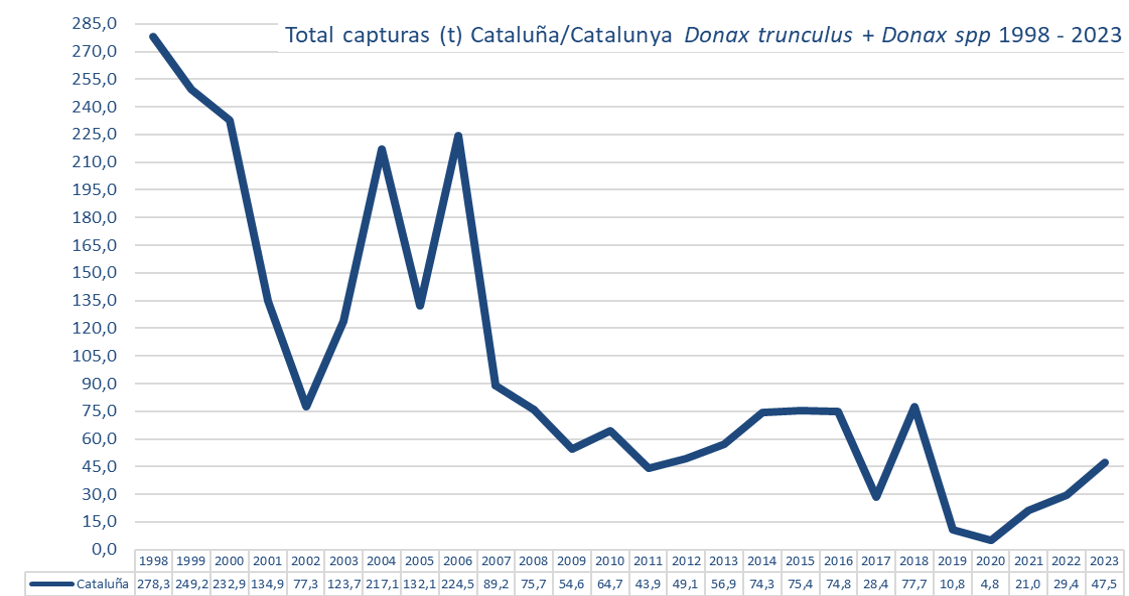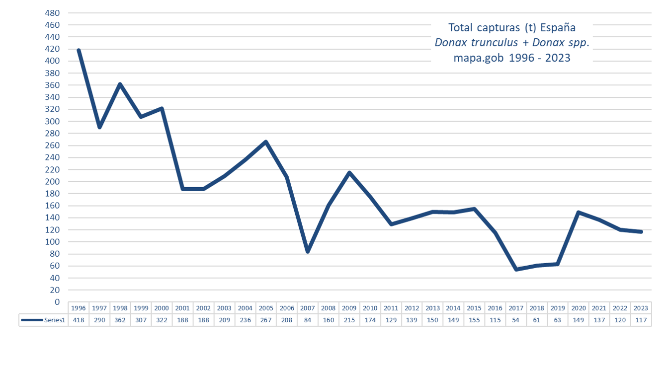 La pesca de Donax trunculus ha experimentado un dramático descenso durante las últimas décadas en las costas españolas lo que ha provocado el cierre progresivo de los caladeros, Murcia en 1998, Baleares en 2003 y Comunidad Valenciana en 2017. A pesar de dichos cierres, los datos de control y seguimiento no muestran claras evidencias de recuperación de las poblaciones.