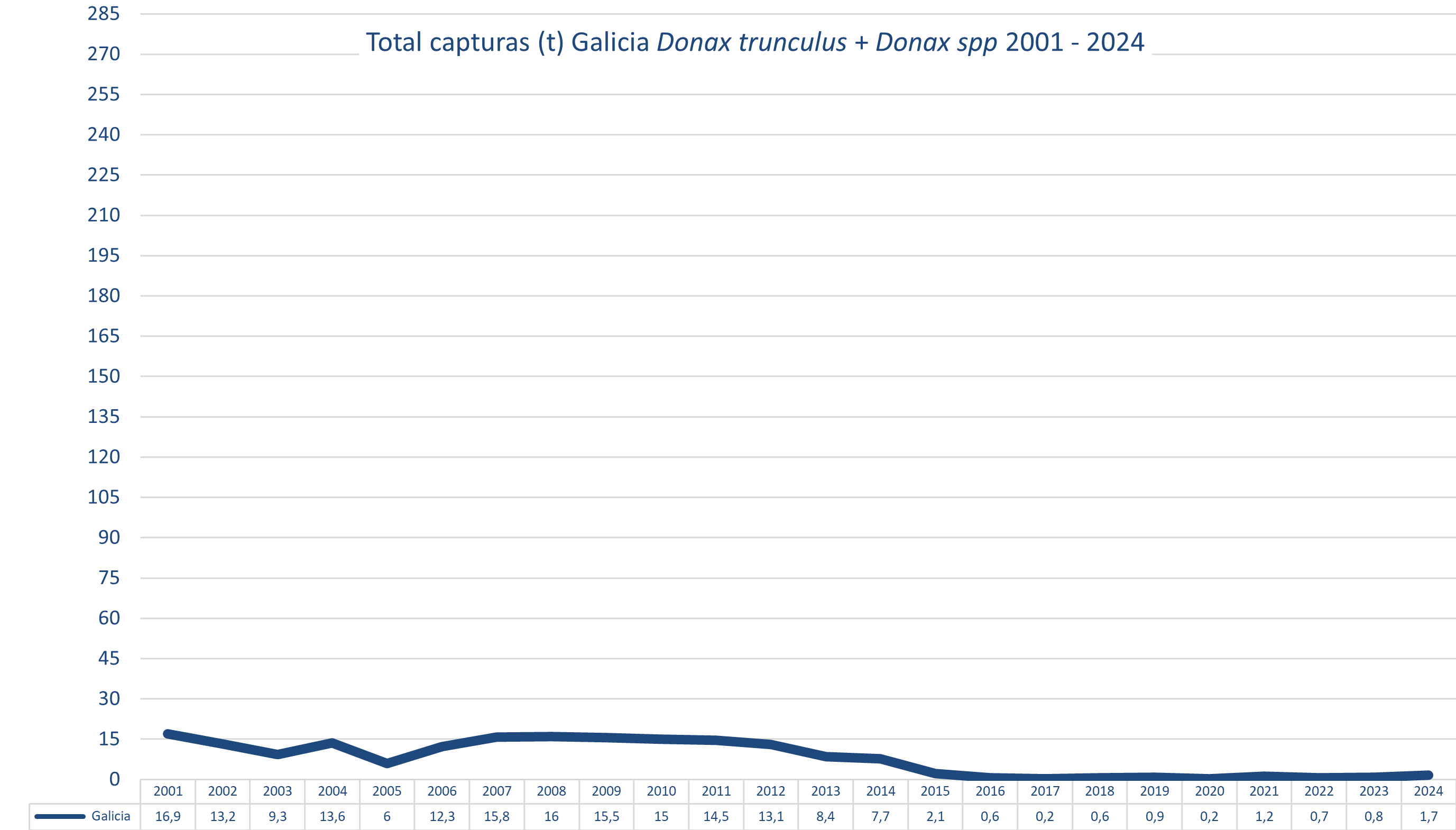 En Galicia, aunque con menores magnitudes, también se ha producido esa debacle, 36 t en 1998, 15 t en 2008 y 0’6 t en 2018. De 2002 a 2012 las capturas han estado estabilizadas entre 13 t y 15 t. Desde 2013 el desplome ha continuado hasta el punto que desde 2016 no se alcanza ni tan siquiera 1 t, 1,7 t en 2024. (Imagen 5.8)