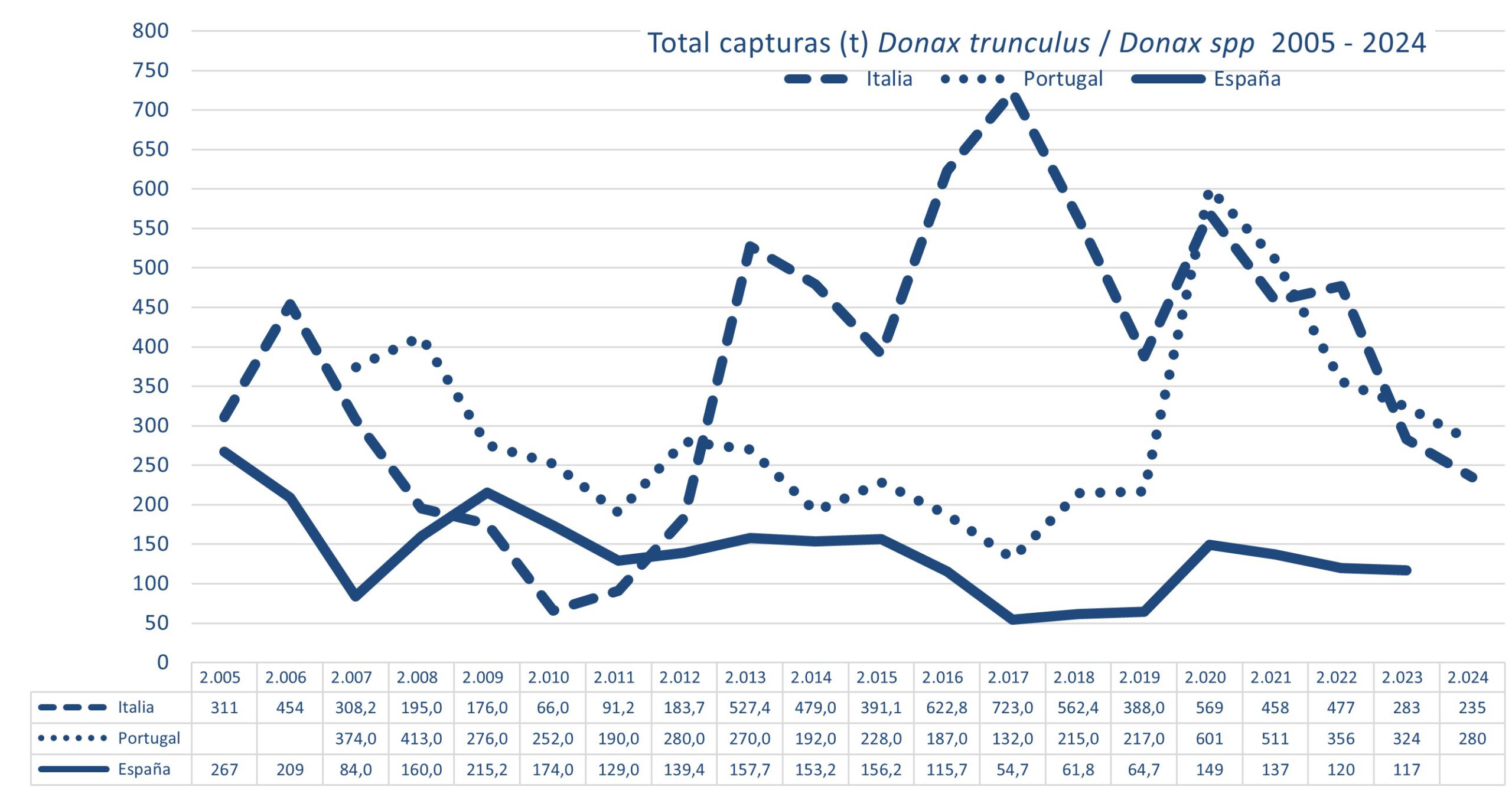 “The State of Mediterranean and Black Sea Fisheries 2018”. FAO: Donax spp representó en 2017 el 2’35 % del desembarque de la pesca en pequeña escala en la subregión Mediterráneo Este (Argelia, España, Francia, Italia (mares de Liguria y Tirreno) y Marruecos).